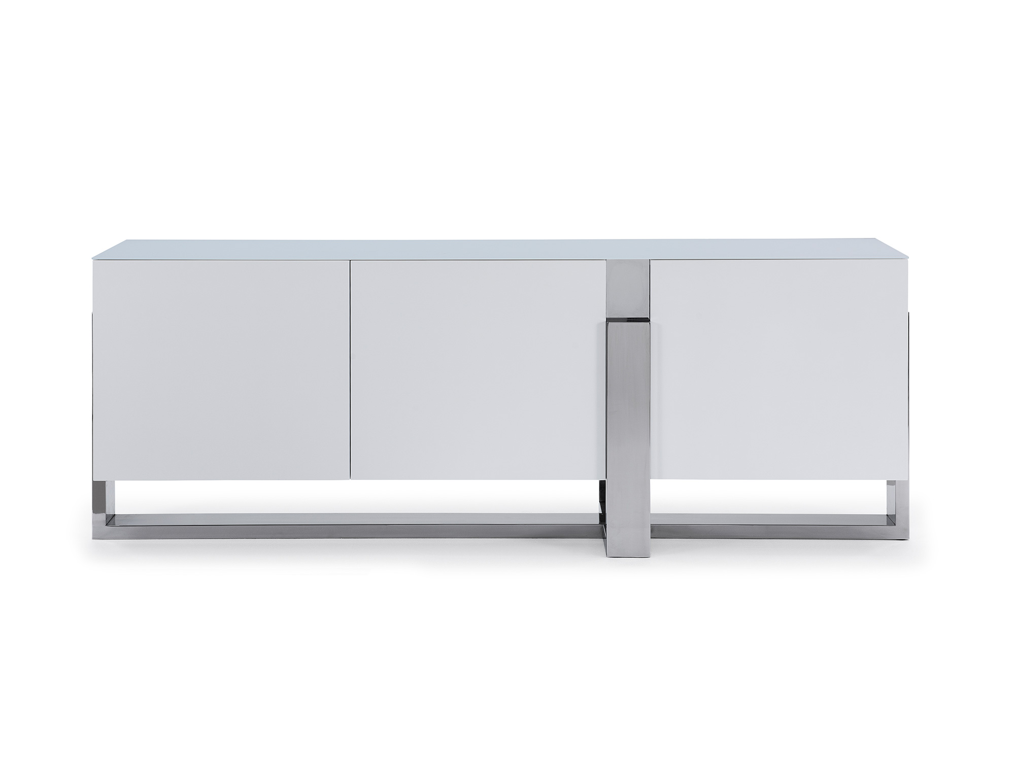 This modern buffet table brings a touch of glamour to any space. It features a 5mm Tempered Crystal Frosted Glass Top with a Matte White finish and a Polished Stainless Steel base.