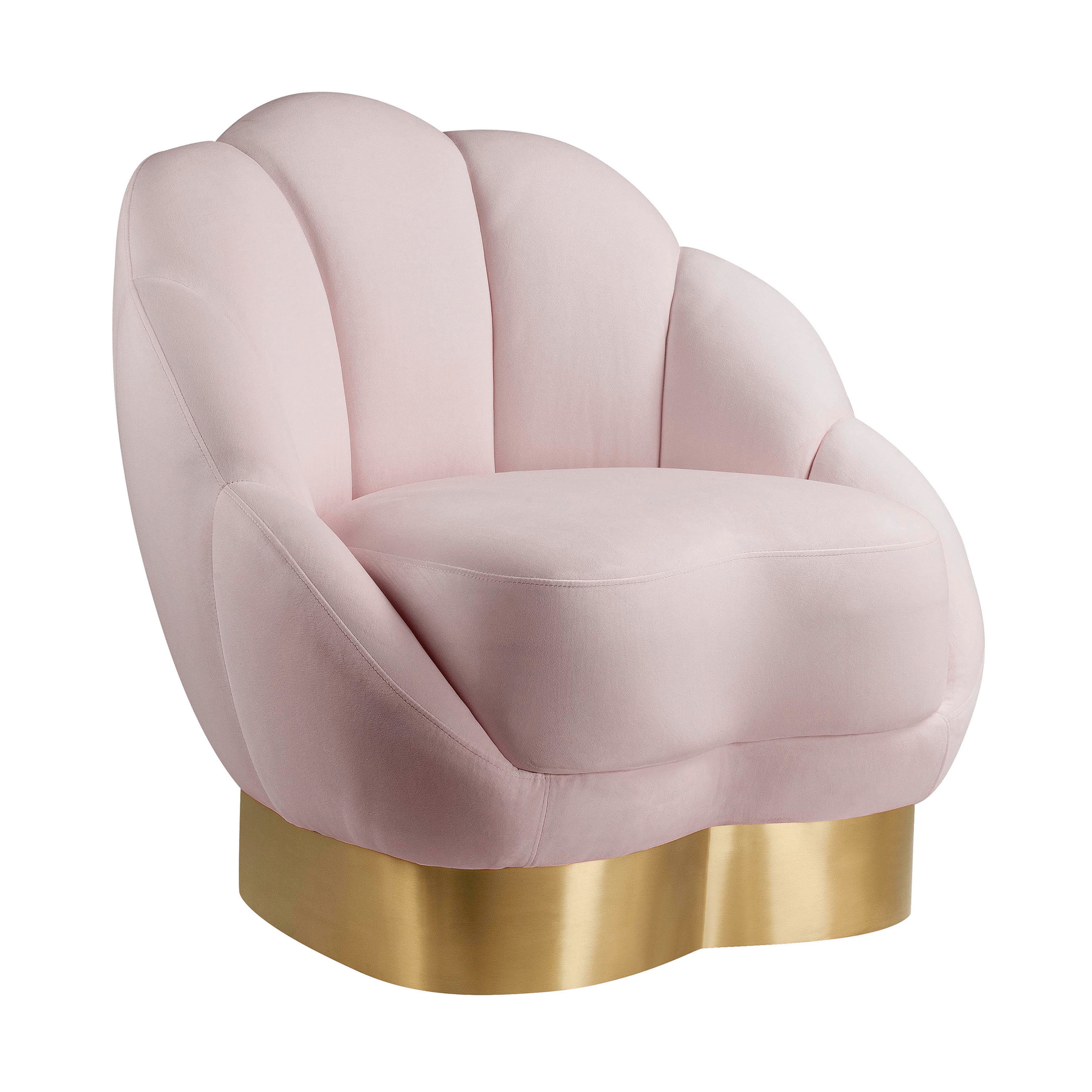 Modern Glam is epitomized in the soft curves and bold design of the Bloom chair by TOV. Boasting posh velvet upholstery, a curved gold base and channel tufting, this chair is sure to dazzle. Available in several soft color options.