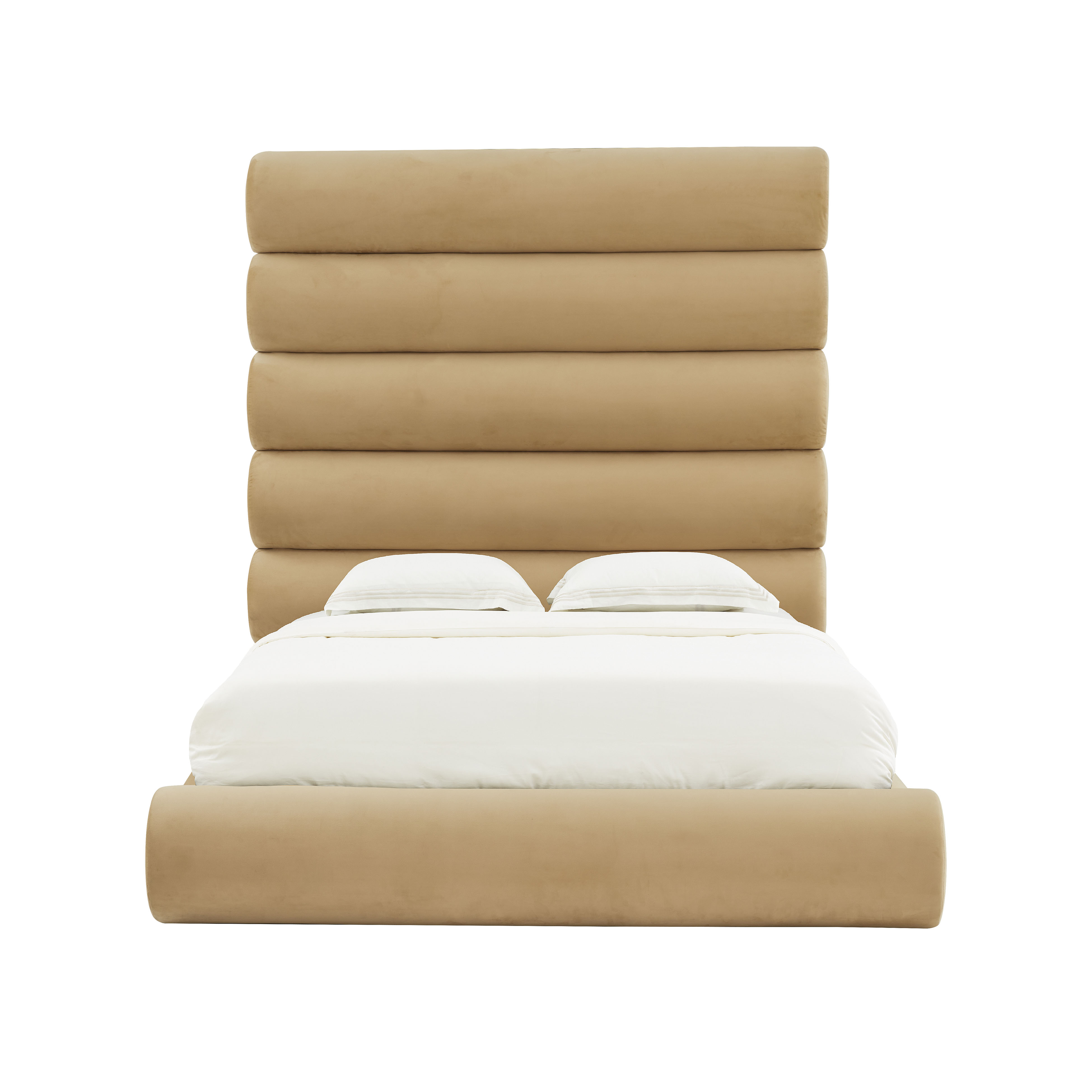 The sculptural and tastefully dramatic Durwin bed will definitely add the extra flair to your bedroom. It features a sturdy pine frame upholstered in lavish velvet, accented by cylindrical tufting for a pop of dimension. Available in queen and king sizes and in black or champagne color options.
