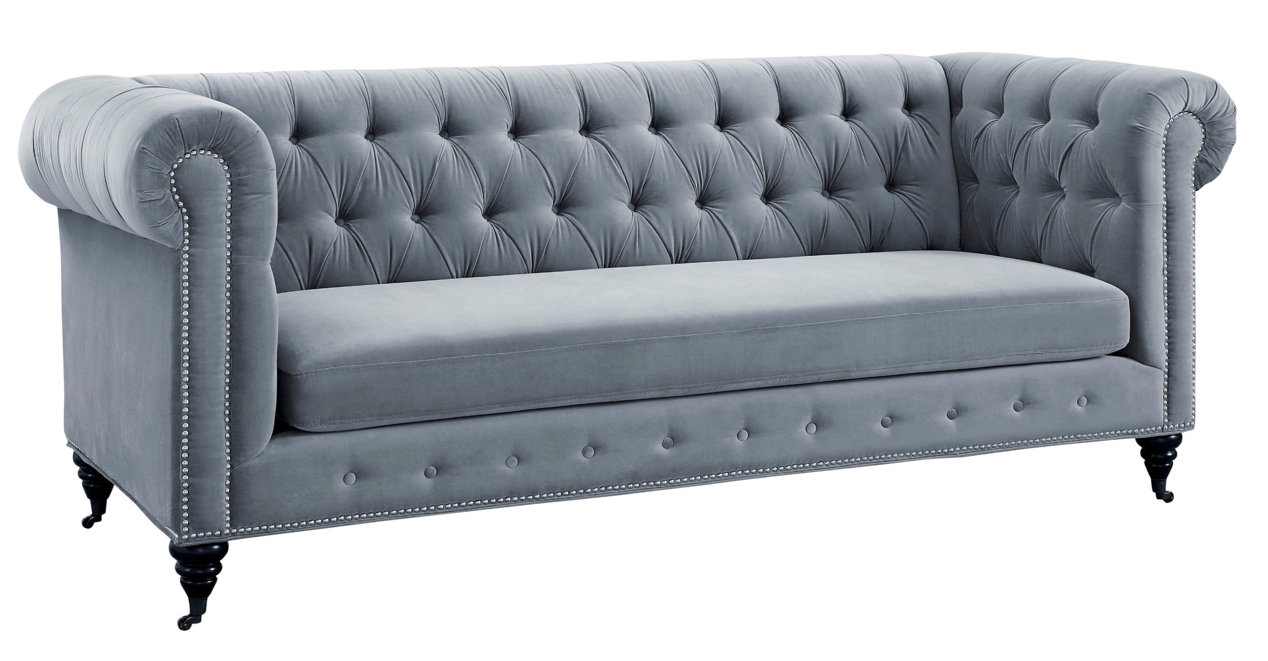 Modeled after its 18th-century forebearer, our stately Hanny sofa remains faithful to the original with handsome silver nailhead trim, and rolled English arms. Its oversized shape and sumptuous velvet upholstery transcend the bounds of time. Featuring a solid wood frame with bun shaped legs, this sofa offers exceptional comfort and will be a coveted focal point of your space. Available in several color options.