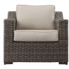 A great chair for lounging on the back patio, Jones features extra thick cushioning, resulting in an ultra-plush seat that allows you to relax and enjoy the view in luxurious comfort. Gently sloped arms and a combination of beige seating and brown wicker give this set a transitional look perfect for the great outdoors.