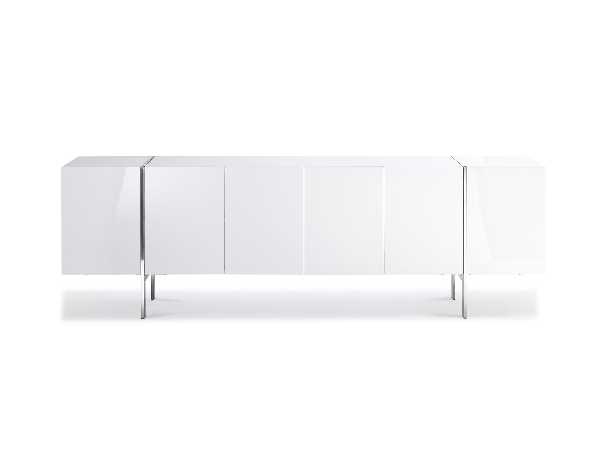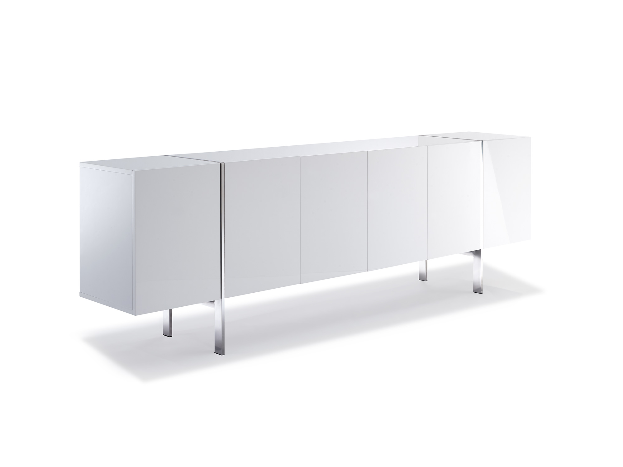 Comes in high gloss white with adjustable shelves and polished stainless steel legs.