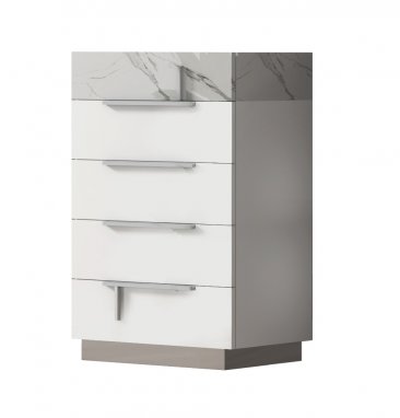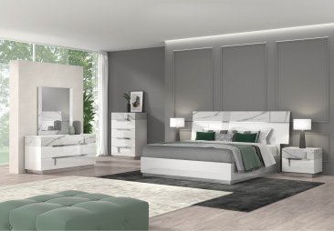 The Sunset Bedroom features a unique Carrara marble finish whose white color and grey stripes complement tastefully the glossy white lacquer. Marble is a very trendy home decoration material especially in modern mid-century styles and add movement and richness to this clean and minimalistic design. The silver base matches the handles finish whose design is made distinctive by the short vertical bars and tie with the geometric lines on the headboard. White marble, white glossy color and stainless steel are finishes that have always been the favorite in modern design.
