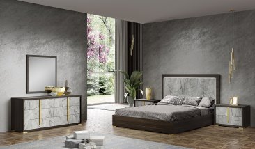 The Travertine Bedroom collection by Blucci Contemporary Furniture is a great new addition to our modern bedroom category. The Travertine Bedroom blends a sophisticated wenge veneer finish with gold accents. The headboard and case goods feature a fractured grey & brown marble look, and the LED light on the bed further highlights this finish. The Travertine Bedroom is made in Italy using the finest quality materials and construction.